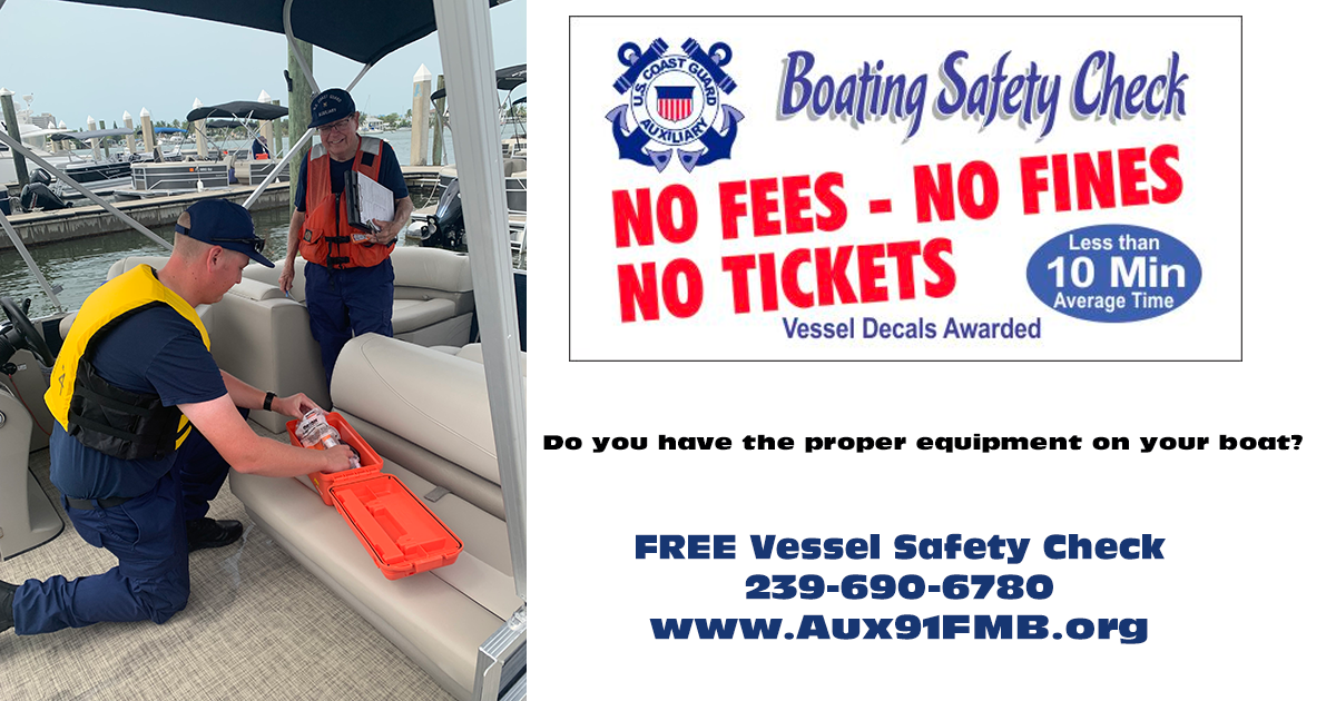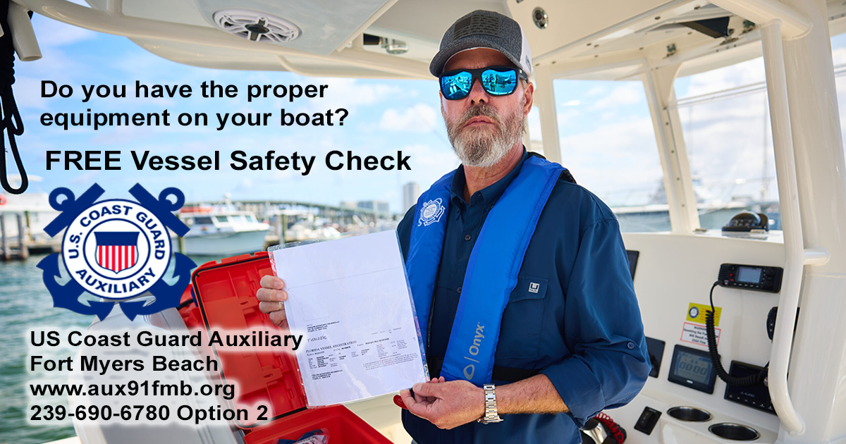 Public Service AnnouncementsGet a Free "No-Penalty" Vessel Safety Check Is your boat 100% ready for the season? To help you stay safe and compliant, we are inviting the U.S. Coast Guard Auxiliary to perform free, "no-penalty" Vessel Safety Checks at our facility. A certified examiner will meet you at your slip to verify that all required safety equipment—like life jackets, flares, and fire extinguishers—is present and in good working order. If your boat passes, you'll receive a Coast Guard Auxiliary decal for your windshield. If it doesn't, no citations are issued; you simply get a checklist of what to fix to keep your passengers safe. Right click on image and save to use it in your communications to your customers.